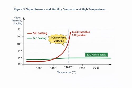 Stabilitate termodinamică de neegalat: Carbura de tantal (TaC) are un punct de topire uimitor de 3880°C. Potrivit cercetărilor din Journal of Crystal Growth, acoperirile de SiC suferă „evaporare incongruentă” peste 2200°C – unde siliciul se sublimează mai repede decât carbonul, ceea ce duce la degradarea structurală și contaminarea cu particule. În schimb, presiunea de vapori a TaC este de 3 până la 4ordine de mărime mai mici decât SiC, menținând un câmp termic curat pentru creșterea cristalelor.